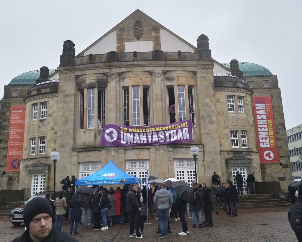 „Deine Gewalt ist nur ein stummer Schrei nach Liebe, deine Springerstiefel sehen sich nach Zärtlichkeit“, schallte es am 25. Januar von den Mauern des Theater. Ein Meer aus verschiedensten Flaggen, Gesichtern, Regenschirmen und Bannern hatte sich hier versammelt um gegen einen Infostand der AfD und der jungen Alternative vor dem Theater zu demonstrieren. Das Theater selbst hatte eine interessante Art des Protests vorbereitet: Bei offenen Fenstern wurde mit dem Hinterteil voran in Richtung des Infostands getanzt und geschauspielert. Außerdem waren zwei Seifenblasenmaschinen in vollem Einsatz.