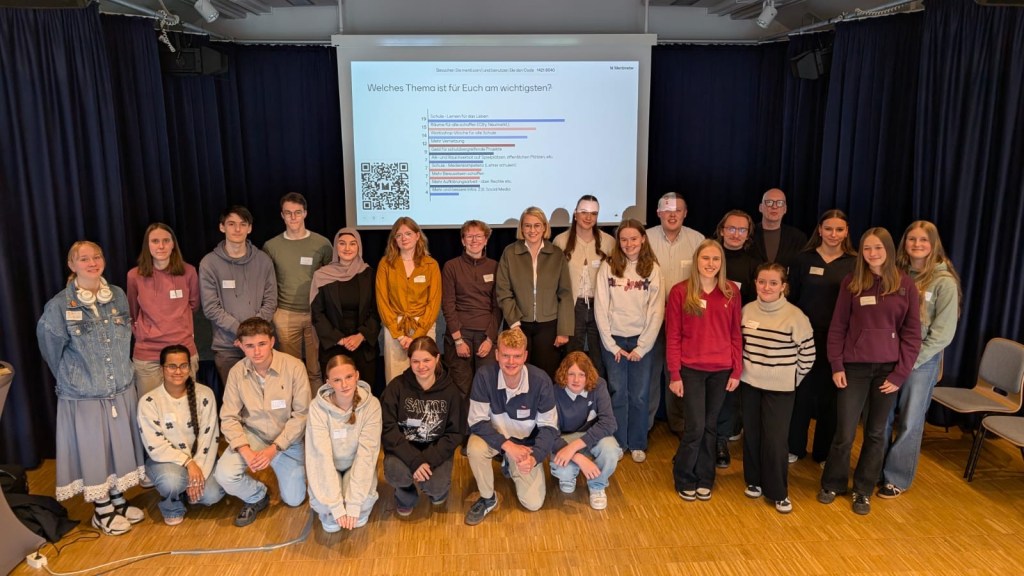 Nach einer krankheitsbedingten Verschiebung, war es am 7.05.2025 endlich soweit! 23 engagierte Schüler*innen kamen in der VHS Osnabrück zusammen, um über Demokratie in ihrem Alltag zu reden. Besonderer Fokus wurde auf die Themen Schule, Familie und Freunde, Vereine und Freizeit, Stadtbild und Deutschland und die Welt. Zu jedem Thema gab es einen Thementisch, an dem konkrete Forderungen und Ziele überlegt wurden. Neben Frau Pötter waren noch weitere Mitglieder*innen des Stadtrats anwesend, die sich ebenfalls die Forderungen der Schüler*innen anhörten.